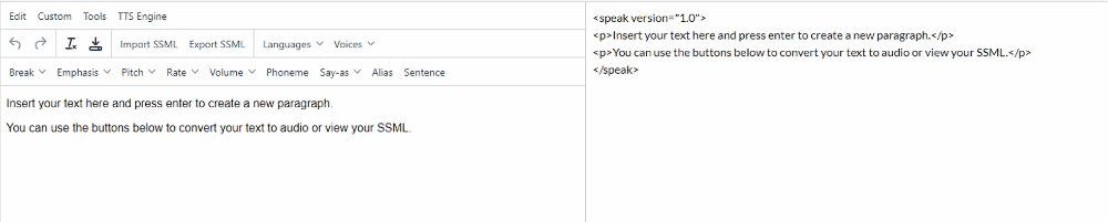 Our easy to use editor allows you to add text, highlight and apply different SSML treatments to parts of your TTS. The player also allows you to see the waveform for your text.