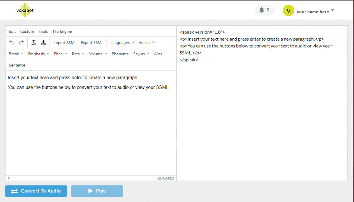 Don’t have a Microsoft Azure subscription, want to hear your speech in another engine which you aren’t connected to? Use Voxabot and load your code and pick the engine and voice of your liking.